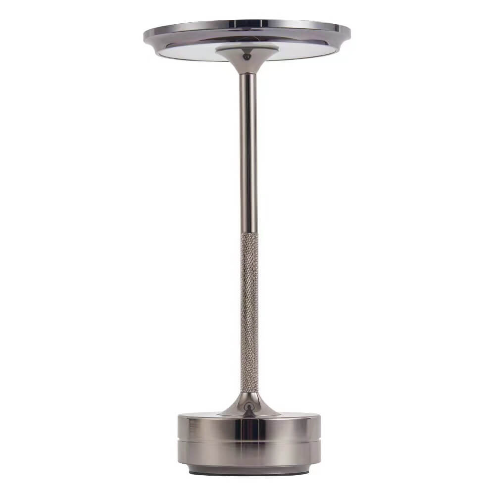 The metal table lamp has a clean shape and a firm, reassuring texture, it is tall and clean and emits a soft light under its top to fill the darkness with a warm glow.